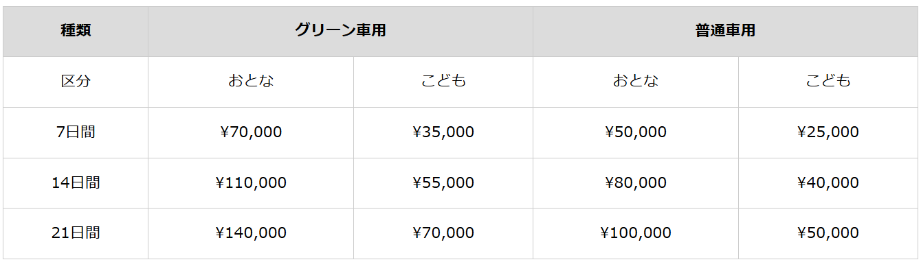 - □ ジャパンレールパスの有効期間は、パスの利用を開始した日から連続する7日間、14日間、21日間です。