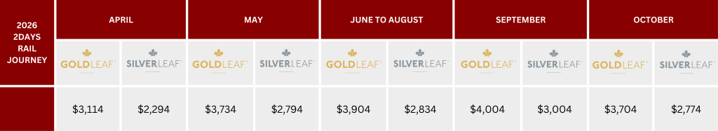 | 料金に含まれているもの | : | 朝食×2 昼食×2 手荷物預かりと駅までの送迎 ホテル1泊 列車内でのチップ |