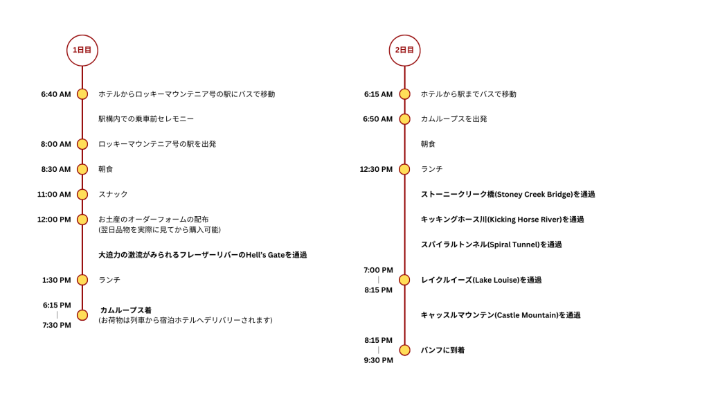 また、最終目的地のバンフからは成田空港への直行便が出ているカルガリー空港までは2時間ほどで移動していただけますので、