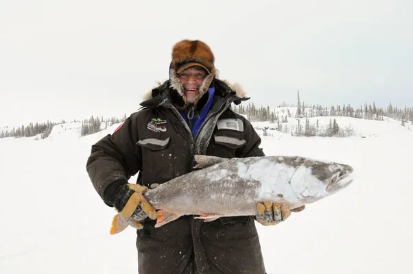 ガイドが先住民のアイスフィッシング用ネットを使った魚釣りを披露します。