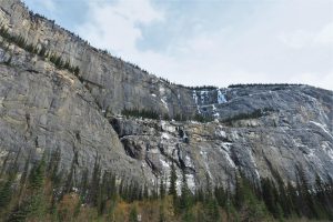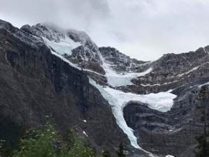 クロウフット氷河<下車観光> 名前の通り「カラスの足」の氷河までの距離や厚みを聞くとロッキーの雄大さがわかります。 |