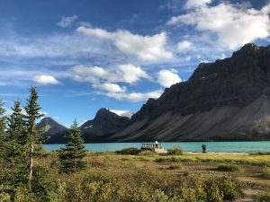 ボウ湖<下車観光> 大きな青い氷河湖が眼前に広がります、湖畔散策時に是非水を触ってみて下さい。 |