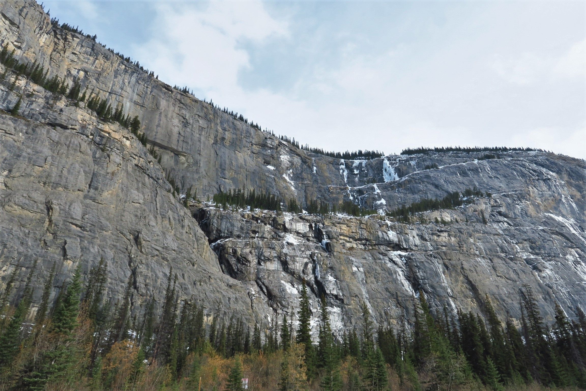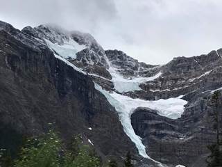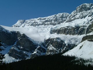 クロウフット氷河<下車観光> 名前の通り「カラスの足」の氷河までの距離や厚みを聞くとロッキーの雄大さがわかります。 |