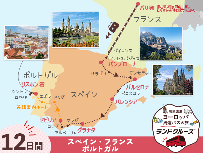 パンプローナ、セビリア、グラナダ、リスボンのほか、ペニスコラ城やアルハンブラ宮殿など世界遺産や見所をしっかり網羅!