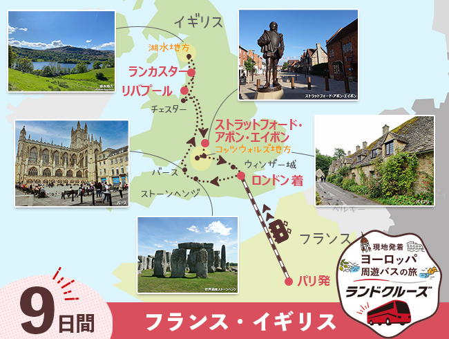 訪問はパリ、ロンドン、ストーンヘンジ、バース、湖水地方、ウィンダミア、チェスター、ストラットフォード・アポン・エイボン、コッツウォルズ/バイブリー、ウィンザー。世界遺産や見所をしっかり網羅!