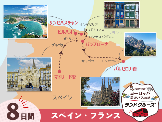 訪問はサラゴサ、モンセラット、バルセロナ、マドリード、ビルバオ/ビスカヤ橋/サンセバスチャン、オンダリビア、バイヨンヌ、パンプローナ。世界遺産や見所をしっかり網羅!