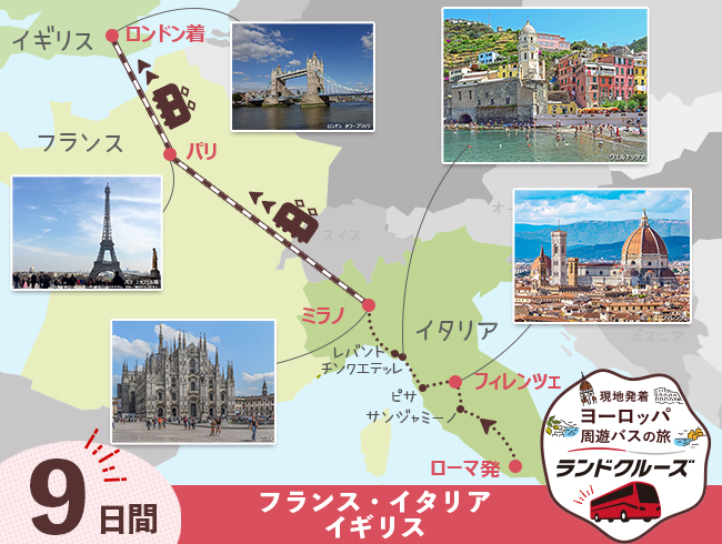 訪問はパリ、ロンドン、ローマ/バチカン、サンジミニャーノ/トスカーナ地方、フィレンツェ/ウフィツィ美術館、ピサの斜塔、チンクエ・テッレ。世界遺産や見所をしっかり網羅!