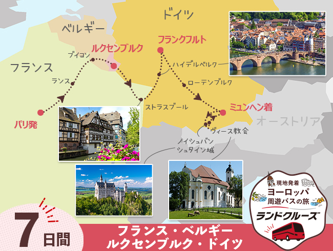 訪問はパリ、ランス、ルクセンブルク、ストラスブール、ハイデルベルク、ローテンブルク、ミュンヘン、ノイシュバンシュタイン城、ヴィース教会。世界遺産や見所をしっかり網羅!