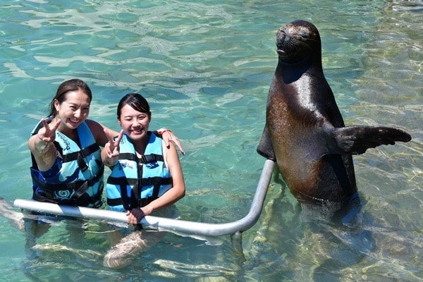 プログラムは「イルカと握手」「イルカとハグ」「ほっぺにキス」「足の裏を2頭のイルカの鼻で押してもらい水面を進むフットプッシュ」など盛りだくさん!