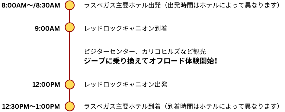 | 集合場所 | : | ・ホースシュー・ラスベガス(旧 バリーズ・ラスベガス) ・サーカス・サーカス ・シーザーズ・パレス ・ザ・コスモポリタン・オブ・ラスベガス ・エクスカリバー・ラスベガス ・マンダレイ・ベイ/フォー・シーズンズ ・ベラージオ ・オヨ・ホテル ・アリア・リゾート&カジノ ・パークMGM ・トレジャー・アイランド ・ミラージュ ・ベネチアン |