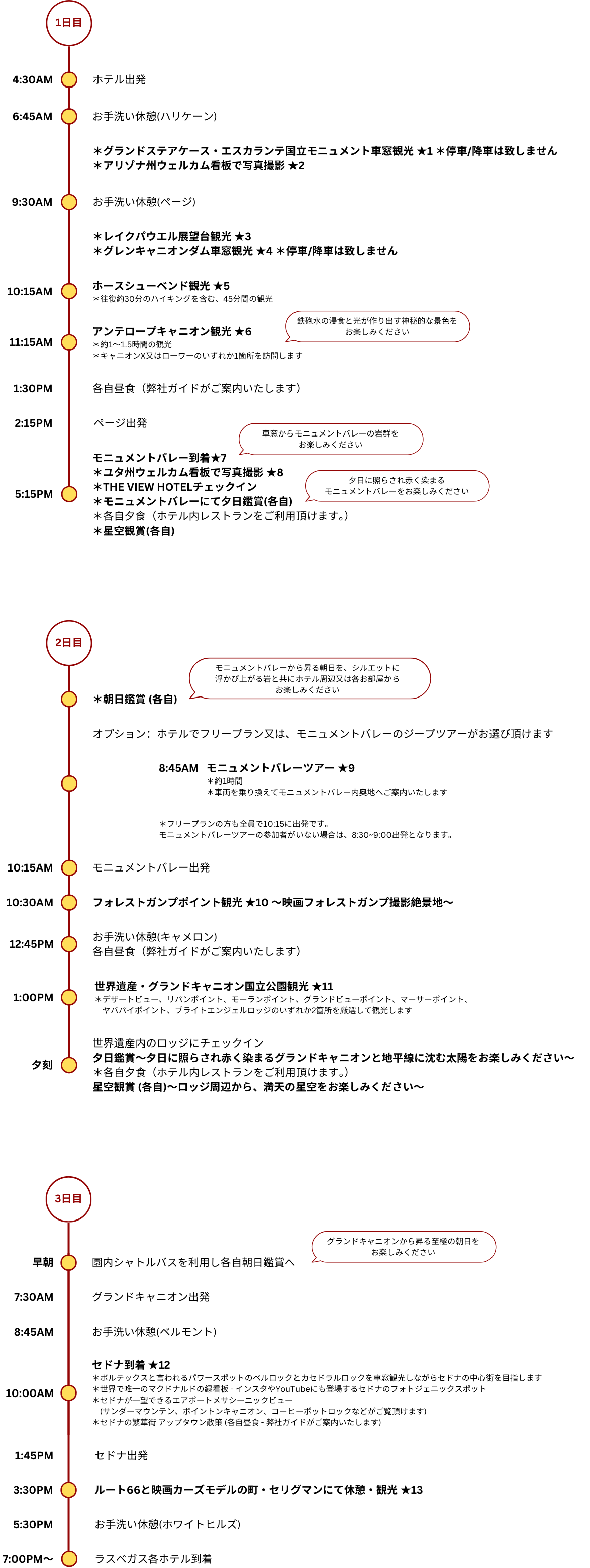 * 最終日の走行距離は約750km(東京-広島間)の長距離長時間ツアーとなる為、天候や道路事情等により大幅にラスベガス帰着時間が遅れる場合がございますので、 帰着後のショーやその他アクティビティのご予約はお控えください。また、夜行バスや飛行機等のご移動の予約もお控えください。万が一間に合わない場合の責任はお取りできません。